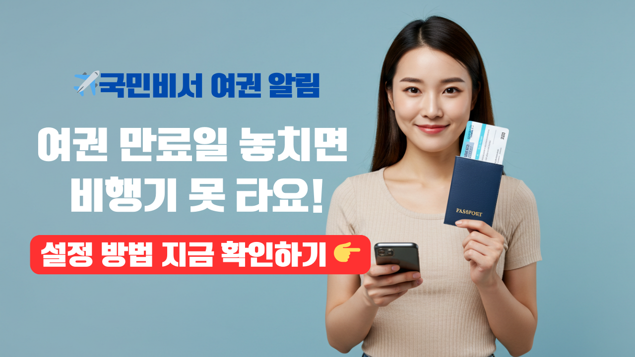 해외여행 앞두고 여권 만료일 몰라서 비행기 못 타는 일, 생각보다 많습니다. 이제 국민비서 서비스를 통해 여권 만료일 알림을 카카오톡, 문자, 토스로 미리 받을 수 있습니다. 간단한 설정으로 여권 문제 미리 예방하세요!